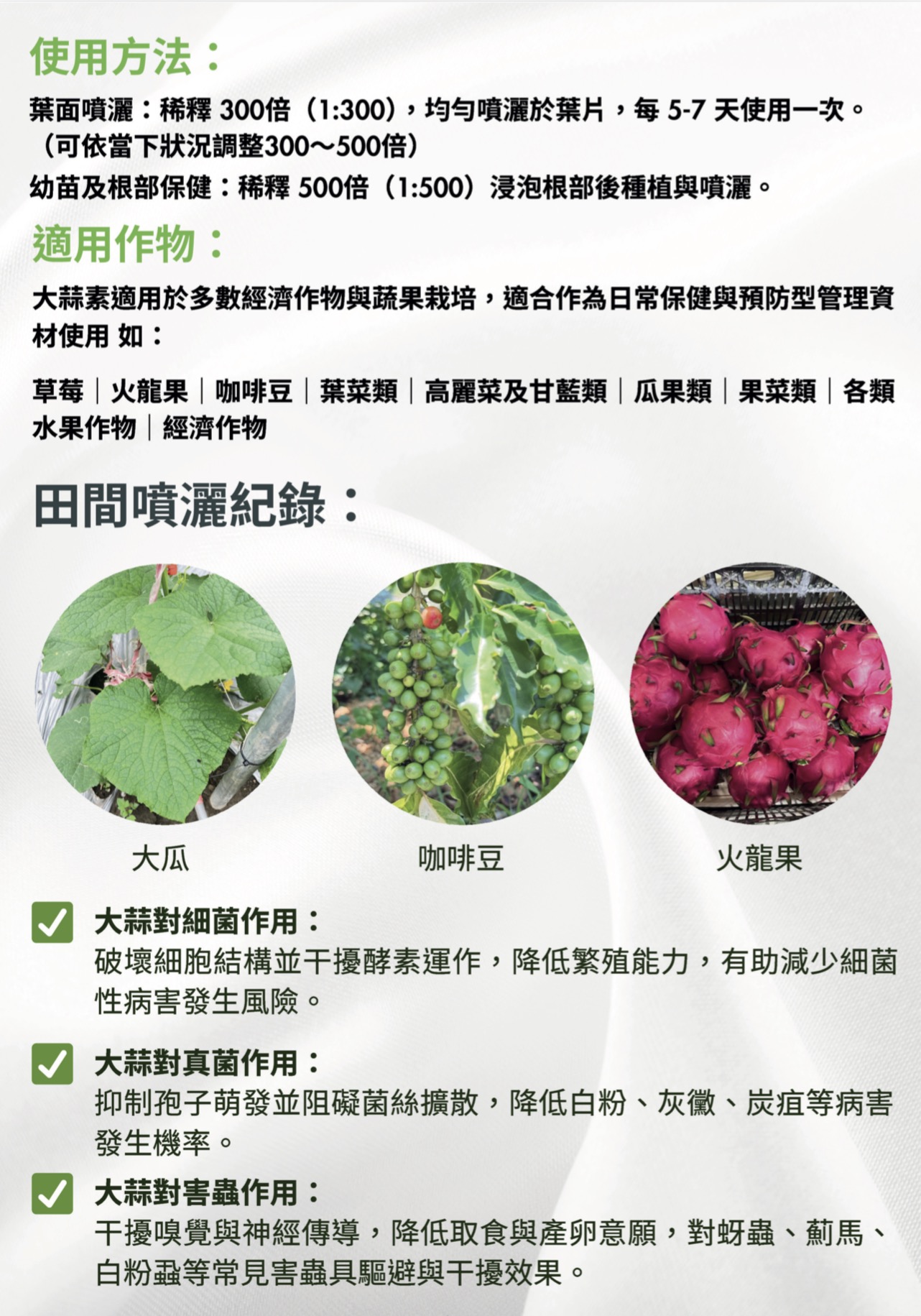 常見病害:白粉病、霜霉病;常見害蟲:蚜蟲、白粉蝨、薊馬等(大蒜素具驅避/干擾趨避性)。